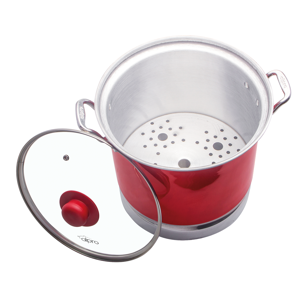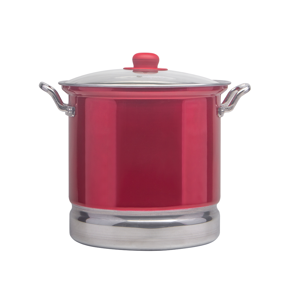 Vaporeras en color negro y rojo con tapa de cristal y disco vaporizador. Si prefieres darle un toque de color a tu cocina, esta línea de productos es para ti. Con variedad de tamaños y la pintura de las vaporeras es electroestática libre de plomo, por lo cual podrás cocinar sin miedo.